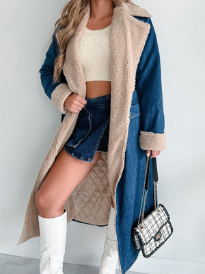 Women's Coat Lambswool Lapel Quilted Cotton Lined Lace-up Double Pocket Denim Windbreaker