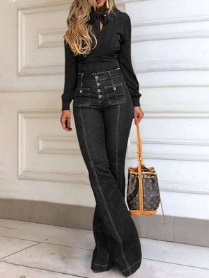 Women's new stretch slim fit spliced high waist flared denim trousers